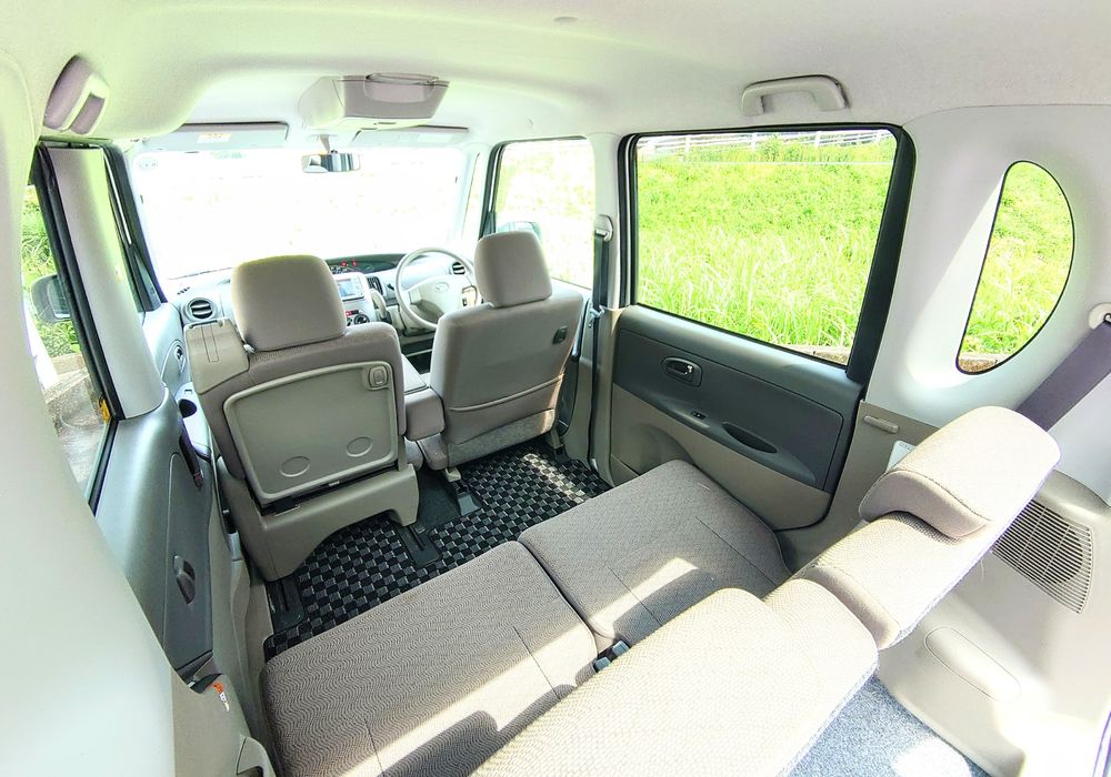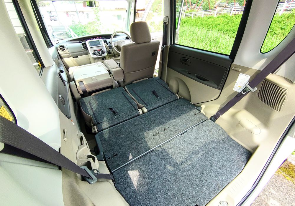 足が組めるほど広いリアシート、前に倒すと長物を積むことができます。休憩にも便利なフルフラットシートなど、多彩なシートアレンジも魅力。小物入れも各所に備えています。